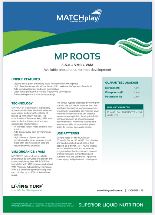 Hunter Lawn Care SuppliesMP ROOTS® (5 - 5 - 3) + VM3 + VAM Available P for root development 5 UNIQUE FEATURES: • Highly effective soil & plant enhancing liquid fertilis...