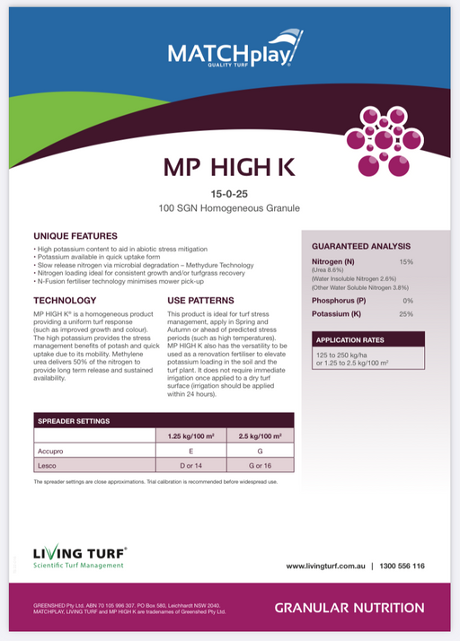 Hunter Lawn Care SuppliesMP HIGH K® (15-0-25) is a homogeneous product providing a uniform turf response (such as improved growth and colour). The high potassium provides t...