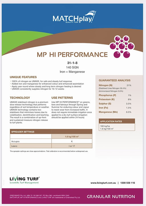 Hunter Lawn Care SuppliesMP Hi Performance (31-1-8 + 2 Fe + 1 Mn), 98% of Nitrogen as stabilised UMAXX® with fast greenup and extended turf response. Added Iron and Mangane...