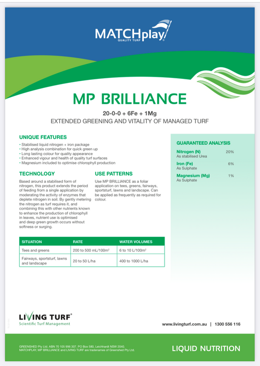 View full detailsMP Brilliance Liquid Fertiliser (20-0-0 + 6Fe + 1Mg) - 20L