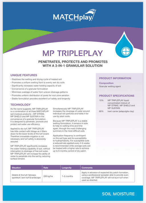 Hunter Lawn Care SuppliesMP TRIPLEPLAY is a combination of all three MATCHplay soil moisture care products – MP STRIKE, MP SHIELD and MP SUSTAIN in the convenience of a gra...